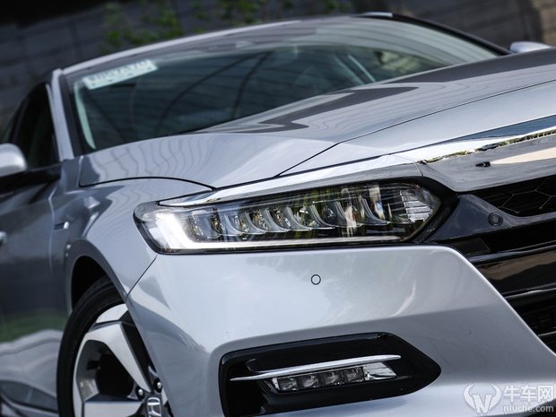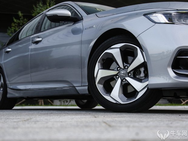 10代雅阁SPORT HYBRID沿用了普通燃油版的外观,你可以通过一些细节来做区分。SPORT HYBRID版全系配备LED近光灯,而且有专属蓝光设计。左右前叶子板上有“HYBRID”标识。排气管的效果被弱化了,单边单出的排气隐藏在保险杠下面。还有轮圈也不一样,顶配和次顶配用的是都是18英寸轮圈,宽度8J,轮胎是235/45 R18。