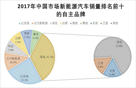 四、2017年,自主品牌销量占新能源汽车市场的78%,排名前五的自主品牌——比亚迪、北汽新能源、知豆、众泰和荣威,市场占有率高达一半以上(56%)。