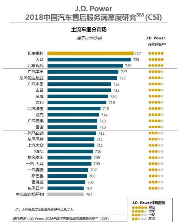 二、长安福特(737分)摘取主流车细分市场售后服务满意度第一,其次是大众(735分)和北京现代(730分)。排名前十的主流车细分市场中有三个自主品牌,分别是荣威(720分)、吉利(719分)和北汽绅宝(715分)。