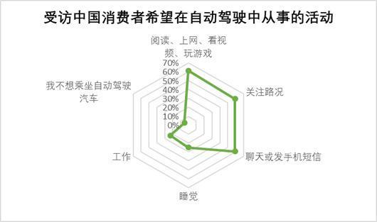 六、虽然不需要亲自驾驶车辆,但消费者对自动驾驶技术并不十分放心,依旧有59%受访消费者表示他们在自动驾驶车辆中会一直“关注路况”。可见,消费者对自动驾驶技术的信任度虽高,但并未完全无顾虑。