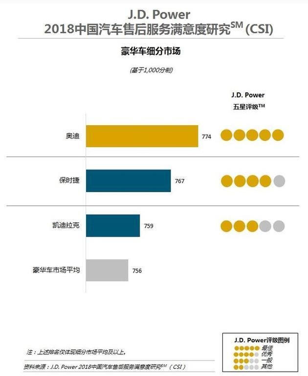 一、根据J.D. Power 发布的2018汽车售后服务满意度排名,奥迪(774分)在豪华车品牌中名列汽车售后服务满意度第一,保时捷(767分)和凯迪拉克(759分)分列第二和第三。