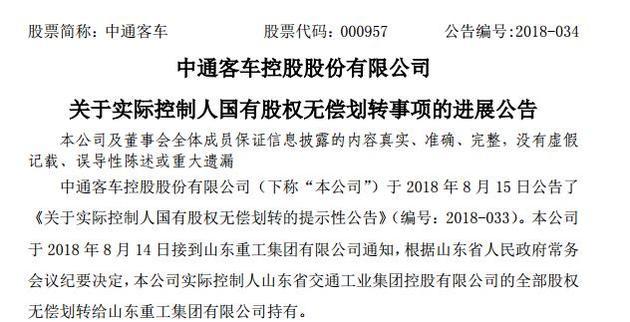 8月15日,中通客车发公告称,根据山东省人民政府常务会议纪要决定,中通客车实际控制人山东省交通工业集团控股有限公司的全部股权无偿划转给山东重工集团有限公司(以下简称山东重工)持有。