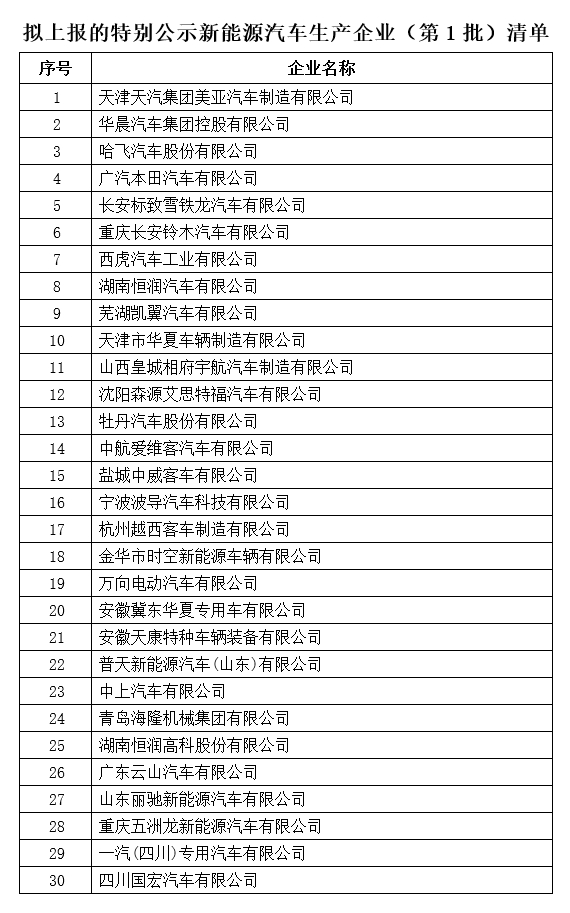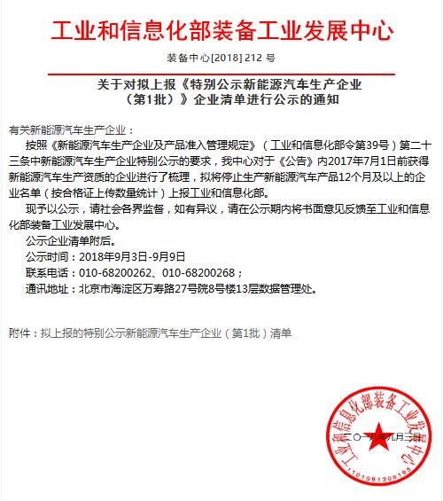 9月3日,工业和信息化部装备工业发展中心在官网上发布了关于对拟上报《特别公示新能源汽车生产企业 (第1批)》企业清单进行公示的通知。