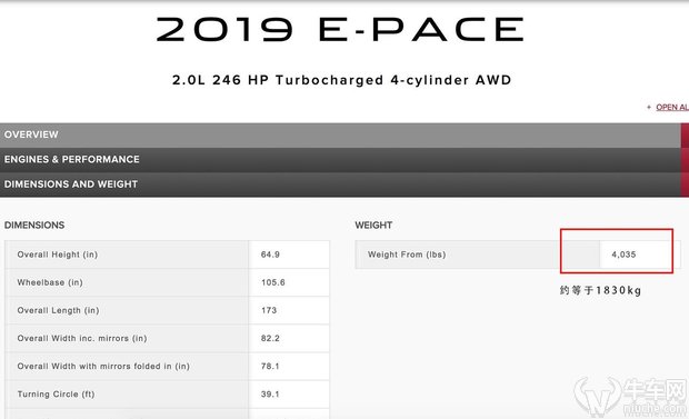 车重国外是4035磅,合计1830kg(美国官网截图)