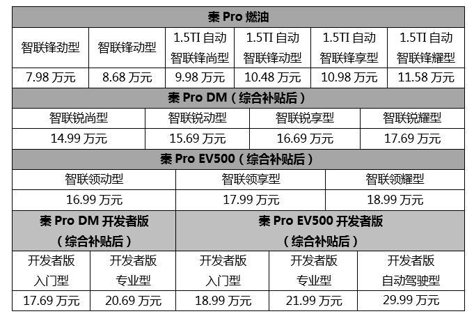 秦Pro覆盖燃油、双模、纯电三种不同动力系统,适应多元化需求。