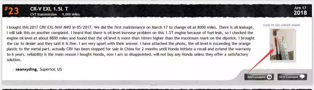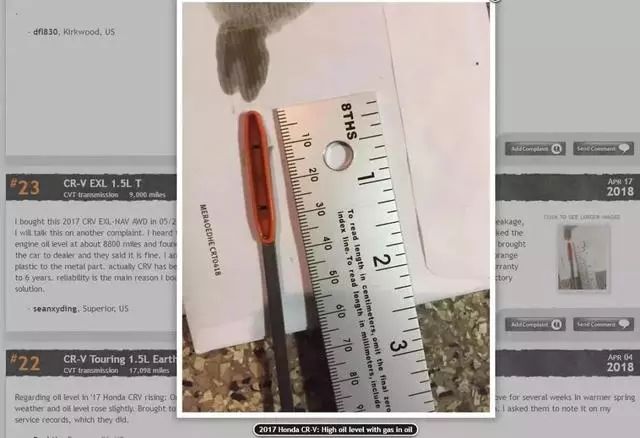 另一位美国CR-V车主表示,他购买的2017款本CR-V 1.5T车型不仅机油泄露,而且机油液位增高超过10mm以上。