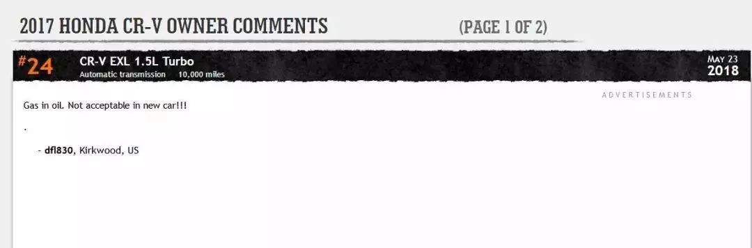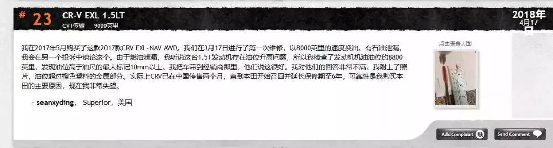 但同样问题,换个地域,本田的态度就不一样。近日,有媒体从外媒投诉网站了解到,美国同样爆发了本田CR-V机油液位增高问题。综合投诉内容来看,美国在售的本田CR-V出现机油增多的情况和中国大陆的情况如出一辙,同样为CR-V 的1.5T的车型。