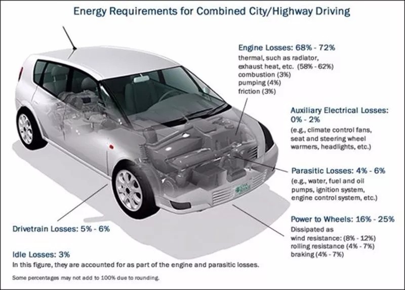 发动机的热效率想必大家都听过,即发动机将所消耗热量转化成机械能的效率。目前市面上常见发动机的热效率在35%-40%之间,这意味着发动机就要浪费掉60%-65%的能源。再加上发动机后面的变速箱及其他传动系统的机械损失,燃油车的能源转换效率仅有16%-25%。