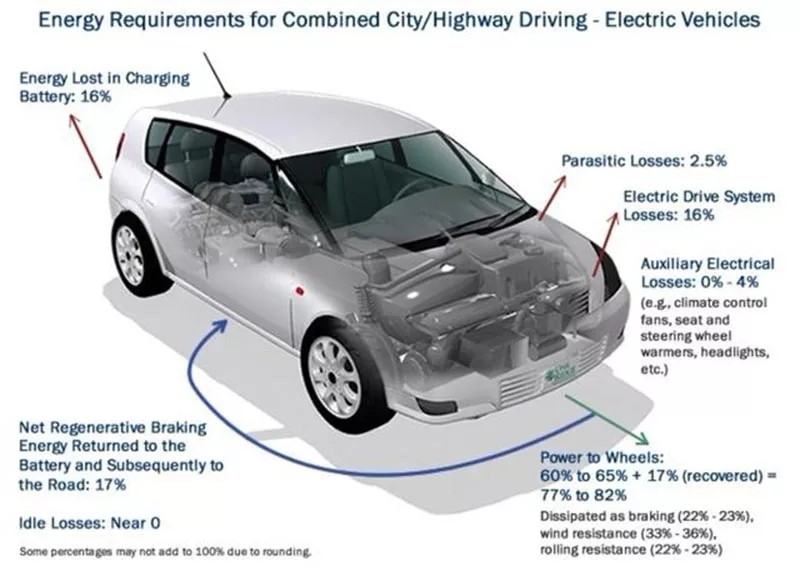 初中物理我们学过,能量是守恒的,要做多少功就要消耗多少能量。能量的形式也是多种多样的,有机械能、化学能、热能等。放在汽车上,我们不能将能量100%的转化为我们所需的动能,因为它会以各种方式散逸掉或被损耗掉,在这点上,电动车与燃油车有较大差别。