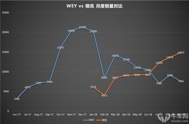 与2017年相比,WEY不仅未完成2018年预定的25万销量,而且距离目标相去甚远。2018年以来,WEY品牌销量被打折,打腰折。相比于去年年底的两万多月销量,只剩下一万多,甚至不足一万,而且情况越来越差。这与后来居上的领克形成了反差。