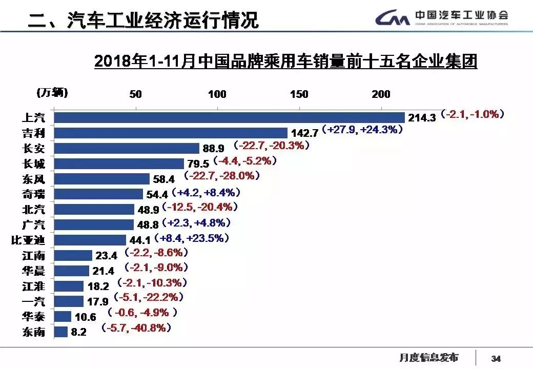 在中汽协的数据表里边可以看出很多信息,比如“中国品牌乘用车销量前十五名企业情况”,这张表最能反映中国自主品牌车企现状的,乘用车是最主要的汽车产品,而所对比的销量数据不包括合资部分,也就是按照自有品牌来比划比划。1到11月,从大到小前十位的是上汽、吉利、长安、长城、东风、奇瑞、北汽、广汽、比亚迪和江南汽车。