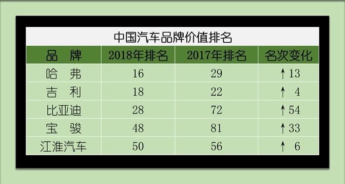 英国品牌评估机构Brand Finance每年都会发布针对全球品牌的评估排名。前段时间,这个机构发布了2018年全球最具价值汽车品牌榜,百强榜上中国汽车品牌上榜数量从去年的15个增加至22个,传祺、荣威、欧尚、银翔等成为新上榜品牌。吉利品牌价值上涨62%达到60亿美元,位居哈弗品牌之后,总体排名从去年的22名上升至18名,位居中国汽车品牌第二。