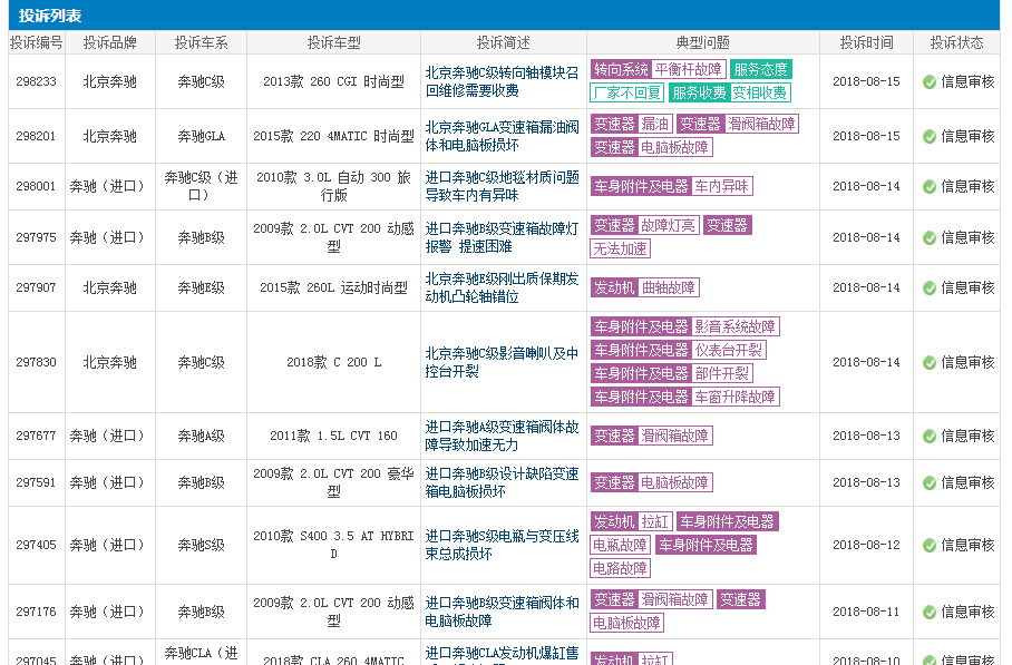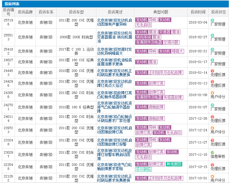某汽车投诉网站奔驰C级车主投诉部分截图