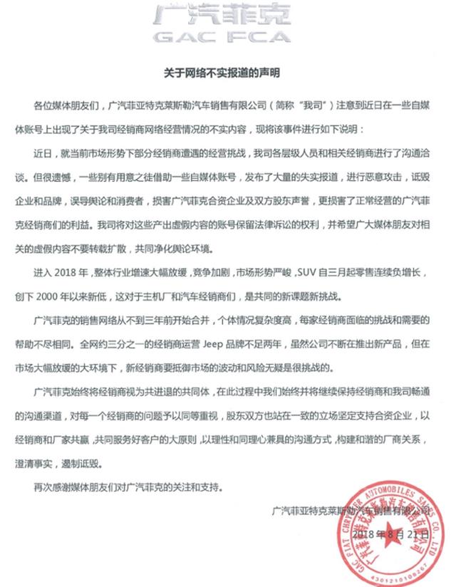 日前,网传广汽菲亚特克莱斯勒(以下简称“广汽菲克”)旗下Jeep品牌经销商因库存过高而对企业不满。广汽菲克随后发布官方声明,予以澄清。