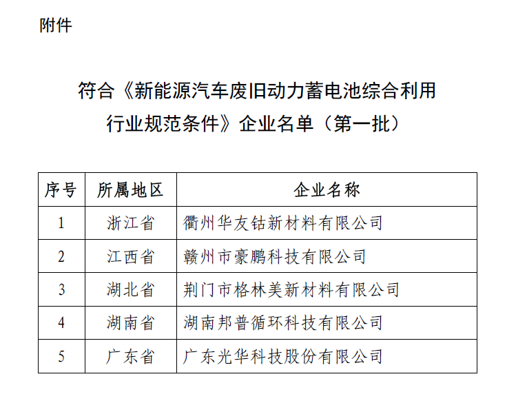 其中包括衢州华友钴新材料有限公司、赣州市豪鹏科技有限公司、荆门市格林美新材料有限公司、湖南邦普循环科技有限公司以及广东光华科技股份有限公司。