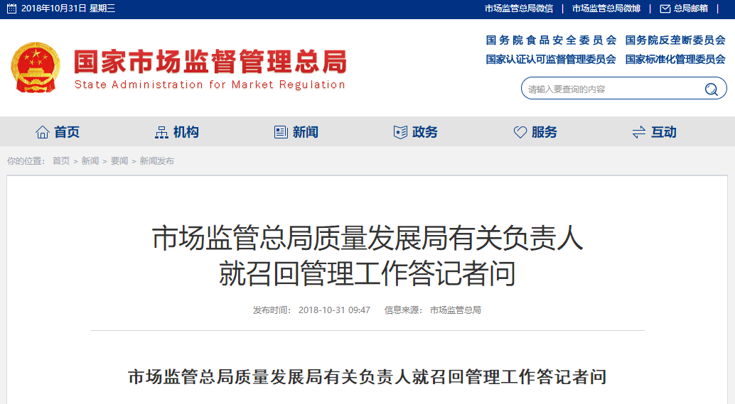 10月31日,市场监管总局网站消息,市场监管总局质量发展局有关负责人就召回管理工作答记者问时表示,“截至2018年10月21日,我国共实施缺陷汽车产品召回1712次,涉及车辆6741.83万辆;实施消费品召回1706次,涉及数量9593.69万件。”
