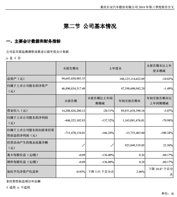 长安汽车今年第三季度财报显示,第三季度营业收入为142.1亿元,同比下滑20.51%,净利润为-4.5亿元,同比下滑137.52%。前三季度营业收入为498.5亿元,同比下滑3.07%,净利润11.6亿元,同比下滑79.98%。每股盈利为0.24元,较去年同期下滑80.17%。
