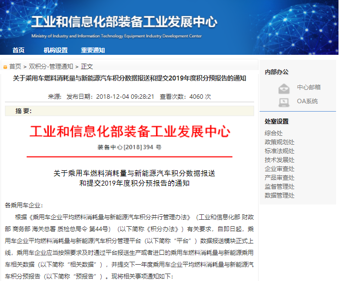 12月4日,工信部装备工业发展中心发布了《关于乘用车燃料消耗量与新能源汽车积分数据报送和提交2019年度积分预报告的通知》(装备中心[2018]394号,以下简称《通知》),乘用车企业平均燃料消耗量与新能源汽车积分管理平台(以下简称“双积分平台”)于12月5日上线,要求企业报送相关数据。