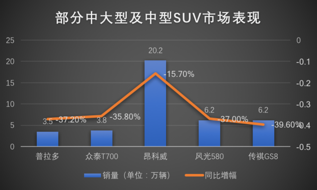 新车型的进入,让之前中大型及中型SUV市场的“老者”在2018年遭遇下滑。如,普拉多销量为3.5万辆,同比下滑37.2%;众泰T700销量为3.8万辆,同比下滑35.8%;昂科威销量为20.2万辆,同比下滑15.7%;风光580销量为11.1万辆,同比下滑37%;传祺GS8销量为6.2万辆,同比下滑39.6%。全国乘用车市场信息联席会秘书长崔东树也认为,2018年SUV优势减弱主要体现在7座的大SUV市场。