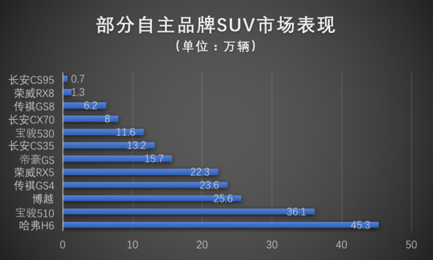 在2018年国内SUV销量排名前十中,自主品牌占据5席,较2017年减少两席,且自主SUV所有上榜车型同比都呈下滑态势。