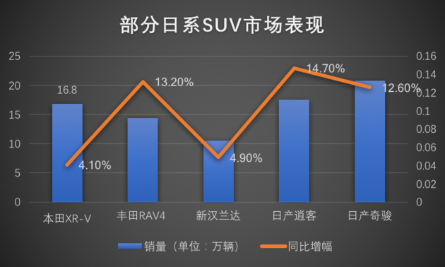 产品的密集推出是合资SUV得以增长的原因之一。如,一汽-大众探歌及探岳、上汽大众途岳、一汽丰田奕泽、广汽丰田C-HR等SUV车型的推出,都为各自品牌带来了新的增量。其中,日系SUV车型表现最为亮眼。