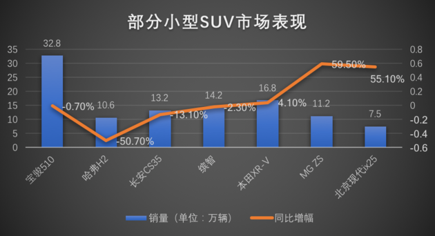 首先,小型SUV市场正在两极分化。比如,宝骏510在2018年销售32.8万辆,同比下滑0.7%;缤智全年销量为14.2万辆,同比下滑2.3%;长安CS35全年销量为13.2万辆,同比下滑13.1%;哈弗H2全年销量为10.6万辆,同比下滑50.7%。相比之下,本田XR-V全年销量为16.8万辆,同比增长4.1%;名爵MG ZS全年销量11.2万辆,同比增长59.5%;北京现代ix25全年销量7.5万辆,同比增长55.1%。