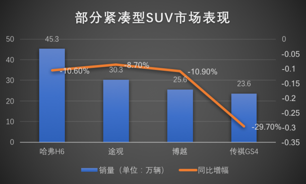 其次,紧凑型SUV市场争斗最激烈。在2018年国内SUV销量排行前十名车型中,紧凑型SUV占据席位最多,市场份额占比也最高。但不可忽略的是,热门紧凑型SUV中不少车型销量下滑幅度均在10%左右。如,“国民神车”哈弗H6在2018年的销量约为45.3万辆,同比下滑10.6%;途观销量为30.3万辆,同比下滑8.7%;博越销量为25.6万辆,同比下滑10.9%;传祺GS4销量为23.6万辆,同比下滑29.7%。