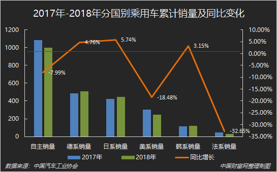 数据显示,2018年,自主品牌销量仍最高,达到997.99万辆,同比下降7.99%;德系与日系分列第二和第三,销量分别达到508.05万辆和444.63万辆,同比增长4.76%和5.74%。