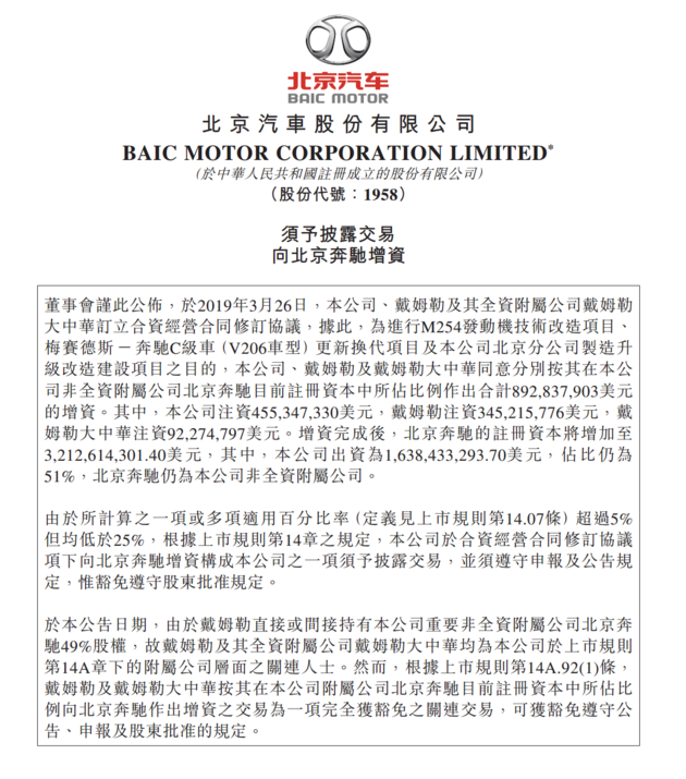 3月26日,北汽股份(01958,HK)发布《须予纰漏交易向北京奔驰增资》(以下简称《公告》)显示,北汽股份、戴姆勒及戴姆勒大中华同意分别按其在北京奔驰目前注册资本中所占比例,作出合计约8.9亿美元的增资。