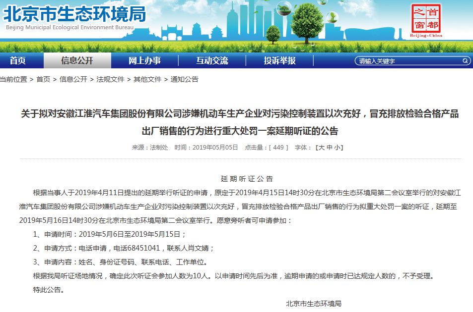 据悉,目前本案原定于今年4月11日举行听证会,经江淮汽车申请延期至5月16日,目前,针对此次案件的具体信息,北京市生态环境局和江淮汽车均没有进行公布。