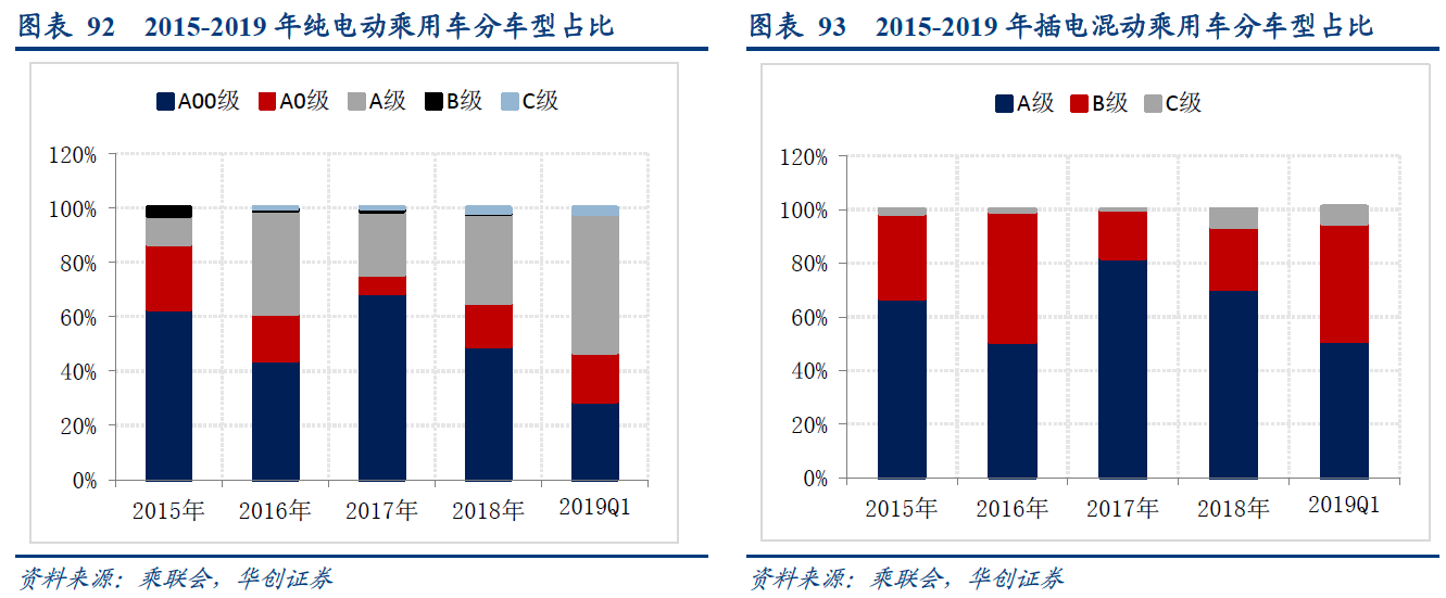 由于新的补贴政策继续向高续航和高能量密度倾斜,高端车型占比不断提升。19年一季度纯电动乘用车中A级车占比从2015年仅10%提升至51%,高端化趋势显著。