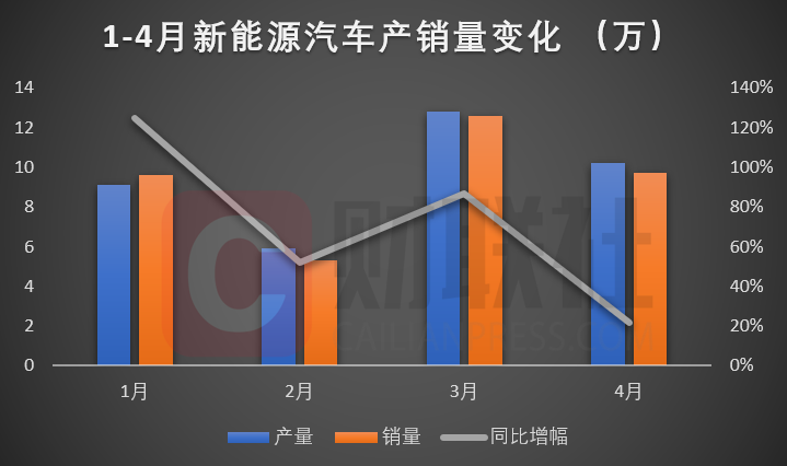加上第一季度的数据来看,1-4月纯电动汽车产销分别完成28.6万辆和27.8万辆,比上年同期分别增长66.1%和65.2%;插电式混合动力汽车产销分别完成8.1万辆和8.2万辆,比上年同期分别增长36.3%和43.7%;燃料电池汽车产销分别完成237辆和230辆,比上年同期分别增长154.8%和289.8%。