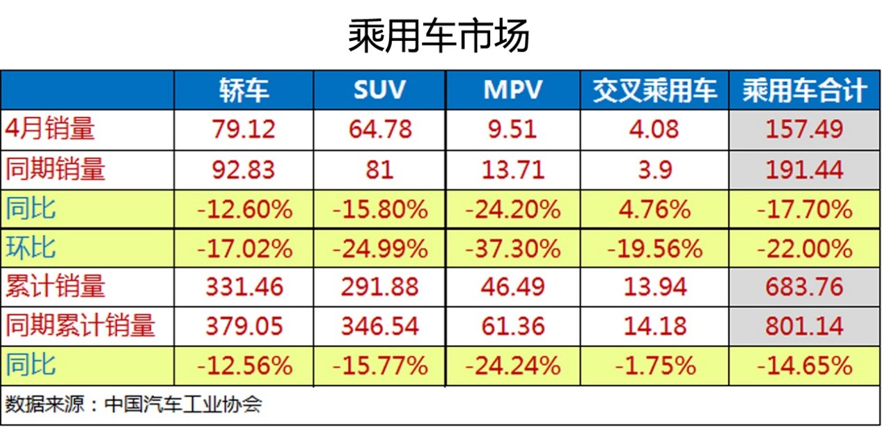 据中国汽车工业协会近日发布的数据显示,4月全国乘用车市场累计销量达157.49万辆,同比下滑17.7%。至此,乘用车市场已连续11个月同比负增长。