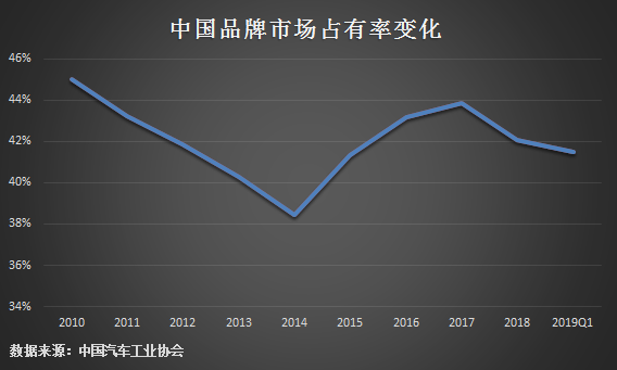 回顾以往,在2010年,中国品牌的市场份额曾达到45%的高点,之后便连续4年下降,在2014年降至38.4%。随后,2015年中国品牌触底反弹,到2017年,市占率已回升至43.8%。但2018年,随着中国汽车市场迎来负增长,中国品牌的市占率也再次下跌至42.09%。而今年1-4月份,这一数字已经降至40.5%。