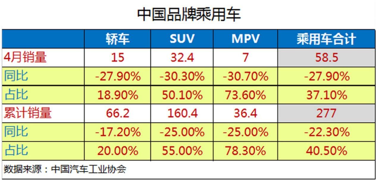 数据显示,4月中国品牌乘用车销量为58.5万辆,同比下滑27.9%,占乘用车总销量的37.1%,与上年同期相比下降了5.2个百分点。从企业公布的产销报告来看,除长城、比亚迪等个别企业,中国品牌车企均出现不同程度的下滑。