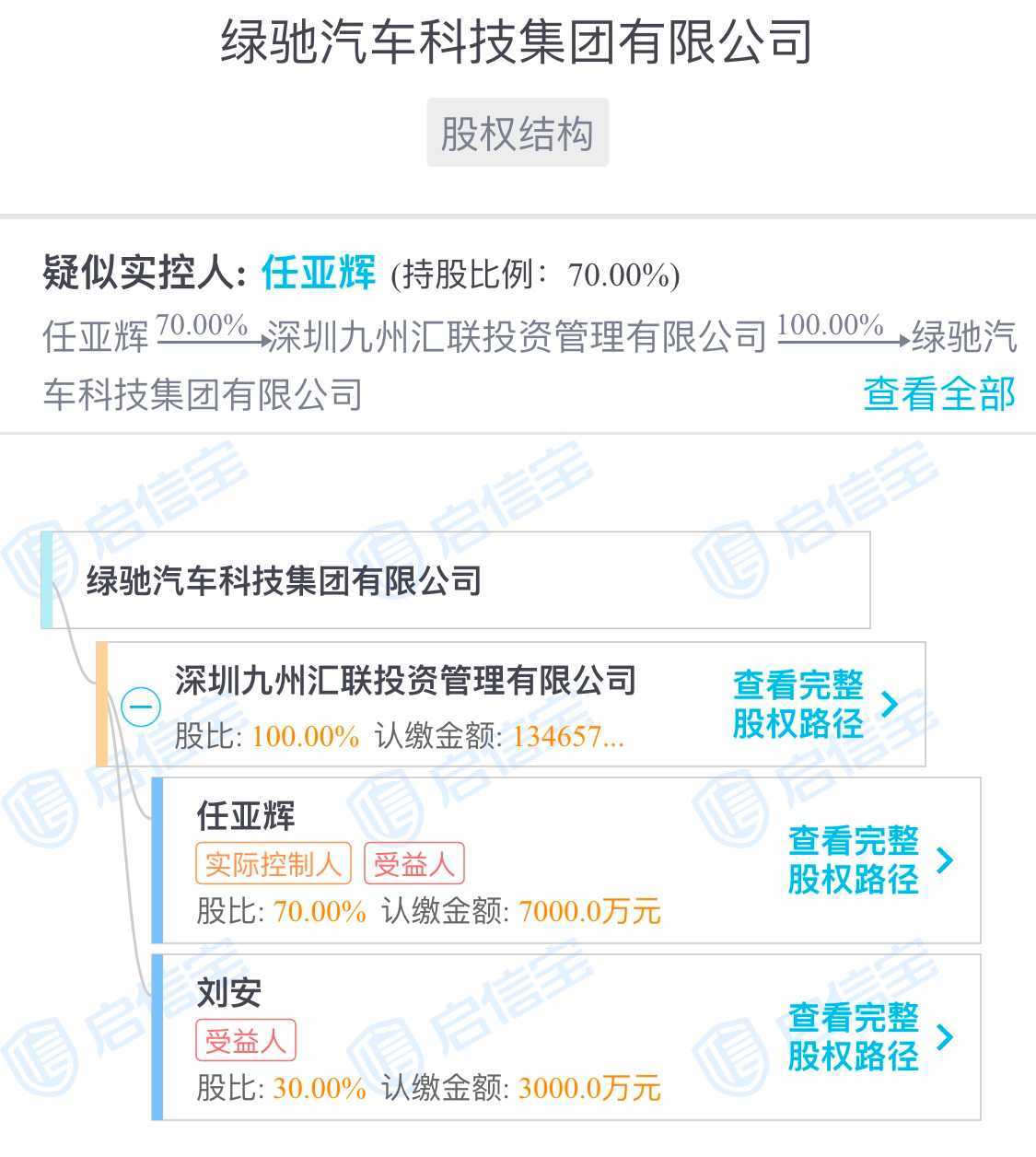 启信宝数据显示,2019年3月25日,绿驰汽车发生多项工商信息变更,其中,公司名称由绿驰汽车科技(上海)有限公司变更为绿汽车科技集团有限公司;公司法定代表人兼董事王向银已退出,变更为任亚辉;公司监事由李三艳变更为刘志强;另外董事一栏新增刘忠厚、张建洲、丁哲、JIFANGSHENG等人。