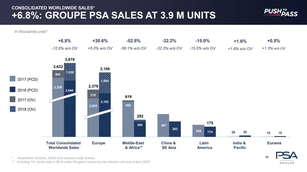 2018年,PSA虽然在中东及非洲市场、中国及东南亚市场出现大幅下滑,但得益于欧洲市场的出色表现,其全年仍然取得了6.8%的增长。从其官方销量统计可以看出,中国及东南亚市场在PSA集团中的规模甚至不如中东及非洲市场。
