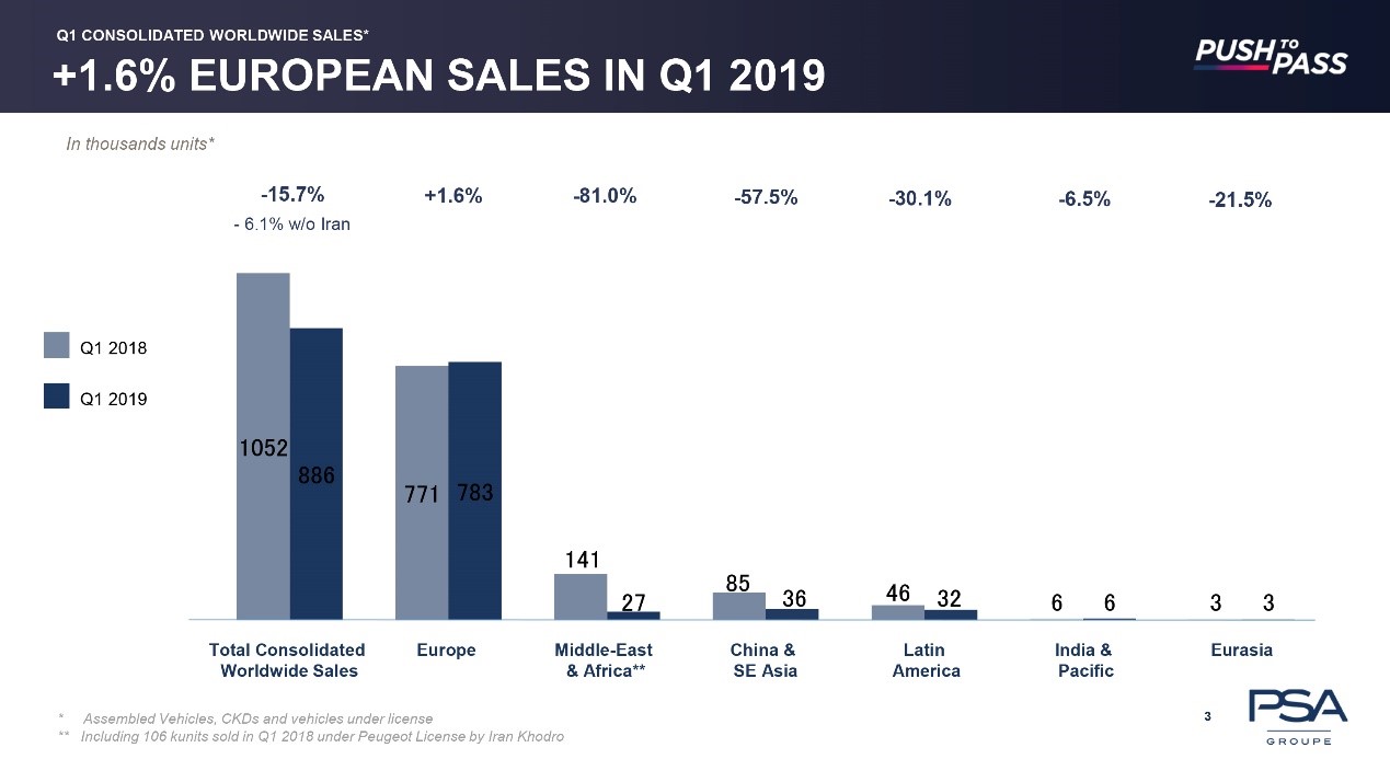 在汽车市场整体下行、竞争空前激烈的大环境下,法系车连遭销量“滑铁卢”,市场份额已跌至1%以下。在华销量的萎靡不振也已经影响了法系品牌全球的业绩表现。根据PSA集团官方统计数据,其第一季度在欧洲市场保持了1.6%的增长,但中东及非洲市场跌幅超过80%,中国及东南亚市场下跌近六成,导致全球总销量下跌15.7%。