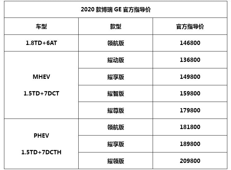 新增1.8T动力 2020款博瑞GE售价13.68万元起