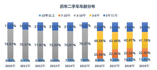 从车龄分布状况看,去年车龄在3年以内的车型交易了369.95万辆,占总交易量的24.79%,与去年同期增长了0.93个百分点;车龄在3~6年车型共交易614.46万辆,占总交易量的41.18%,与去年同期下降了1.49个百分点;车龄在7~10年的车型相比去年占比下降了0.19个百分点,共实现334.31万辆的交易;车龄在10年以上的车型比例与去年同期相比小幅增长0.76个百分点,共交易173.56万辆。