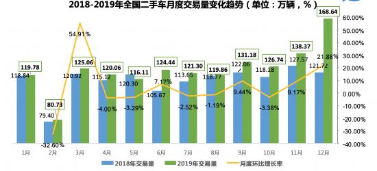 数据显示,去年12月全国31个省的1068家二手车交易市场共交易二手车168.64万辆,环比增长21.88%,交易金额为1039.27亿元,创单月交易量历史新高。去年全年二手车累计交易1492.28万辆,累计同比增长7.96%,交易金额为9356.86亿元,累计同比增长8.76%。