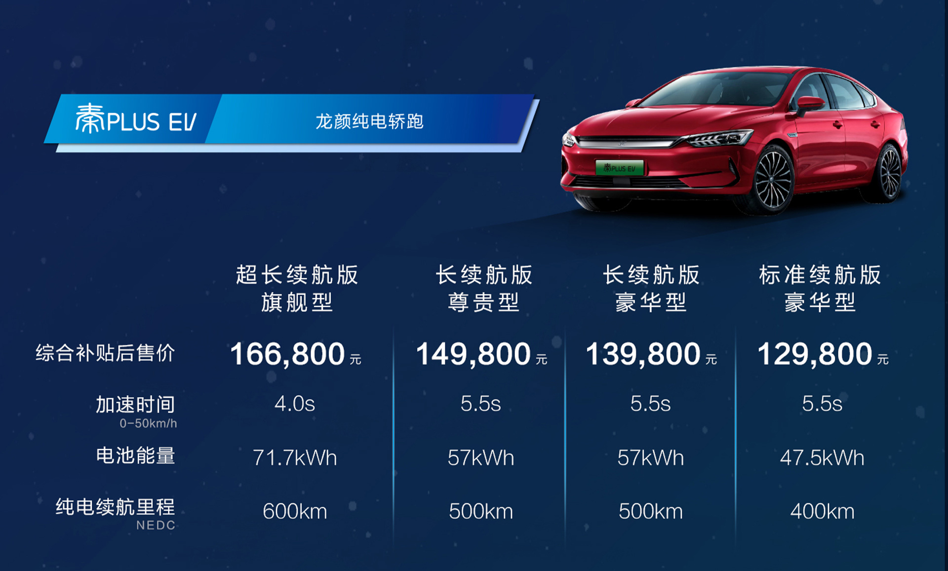 秦PLUS EV延续大放异彩的EV Dragon Face设计语言,整体线条饱满灵动,搭载刀片电池也摆脱了里程束缚和充电焦虑。其超长续航版车型0-50km/h加速时间仅为4秒,并具备600公里超长续航,百公里电耗低至12.9kWh。30分钟直流快充,即可使秦PLUS EV的电量从30%充至80%。