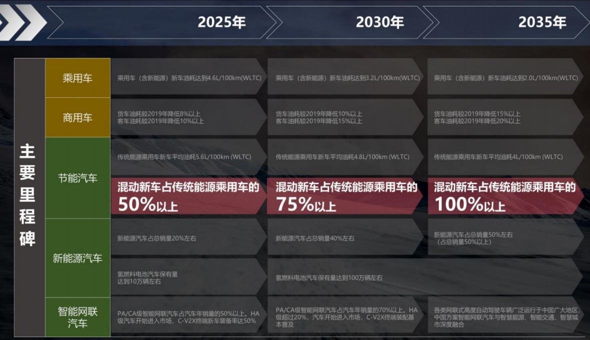 近年来,我国日益重视汽车行业的节能环保,政府部门和行业协会陆续出台了诸多政策和文件,大力倡导新能源和节能汽车,指引和推动汽车行业的绿色发展。特别是2020年出台的《节能与新能源汽车技术路线图2.0》指出,到2035年,新能源汽车将占国内汽车总销量的50%以上,而混动新车在传统能源乘用车中的占比将达到100%。