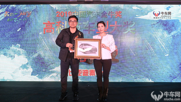 2019中国汽车金牛奖之高科技车型大奖 比亚迪秦Pro,颁奖者为:牛车网创始人兼CEO海兰,领奖者为:比亚迪销售有限公司副总经理李云飞。