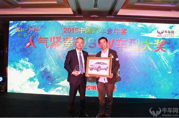 2019中国汽车金牛奖之人气紧凑型SUV车型 吉利2018博越,颁奖者为:北京市产品质量监督检验院副院长兼国家汽车质量监督检验中心(北京)常务副主任彭永伦,领奖者为:吉利汽车销售公司的副总经理陈洪生。