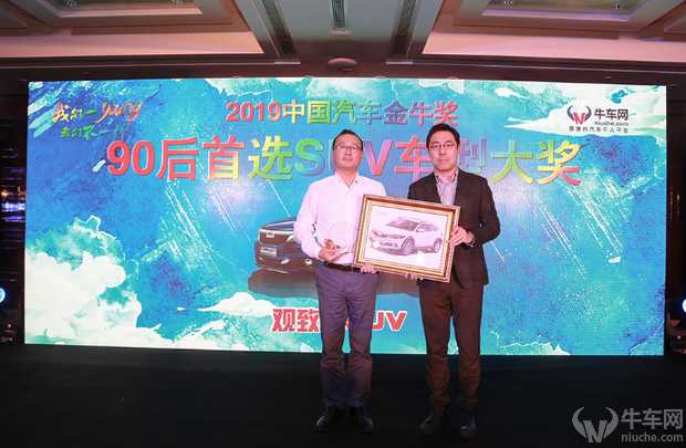 2019中国汽车金牛奖之90后首选SUV车型 观致5 SUV,颁奖者为:新浪汽车总编辑闫小欧,领奖者为:观致汽车有限公司副总裁、销售公司常务副总经理 陈思英。