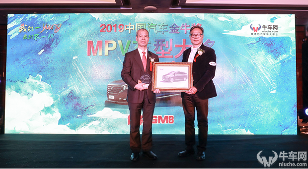 2019中国汽车金牛奖之MPV车型大奖 广汽传祺GM8,颁奖者为:中国汽车流通协会副秘书长罗磊,领奖者为:广汽乘用车常务副总经理詹松光。