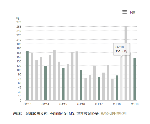 用于电子、无线和LED照明等应用的黄金科技需求量下跌3%,至79.3吨。贸易摩擦、消费电子产品销售疲软以及全球经济逆风冲击了科技行业的用金需求。