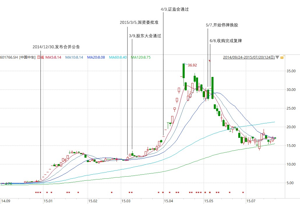 南北车合并案期间中国中车(原中国南车)股价走势