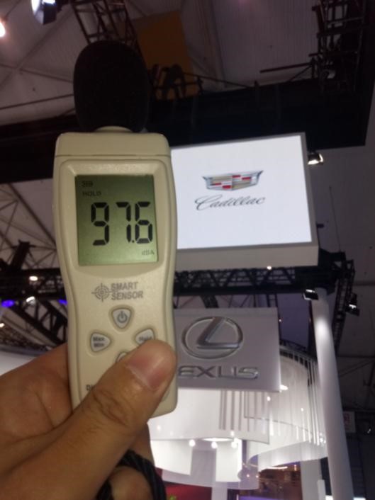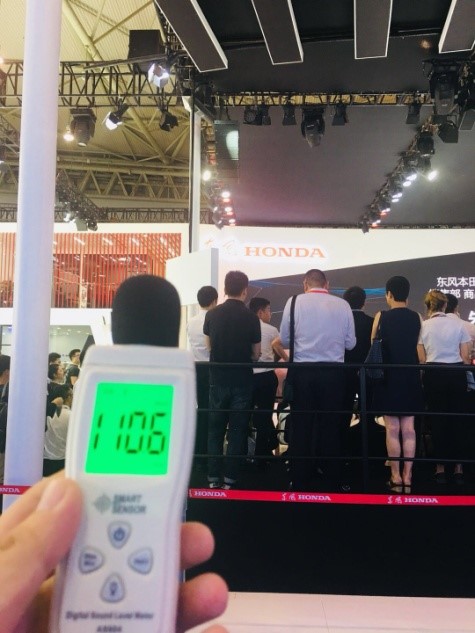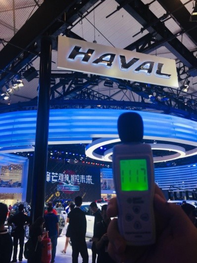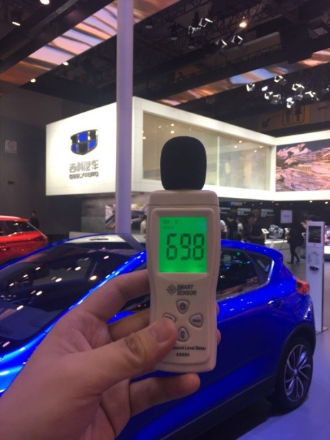 按照环境噪音标准,昼间噪音分支不得高于70分贝,如果长期工作在超过70分贝的噪声环境中,会对神经细胞造成损伤。而在媒体日当天,经噪声仪器测试,所有展馆噪声都超过70分贝,大多数车企展台在举办活动时噪声达到90分贝,而个别企业,比如哈弗汽车展台、长安铃木展台、东风Honda等噪声超过100分贝。值得表扬的是,吉利展台远低于其他品牌展台的噪音分贝,69.8分贝称得上此次车展最安静展台。
